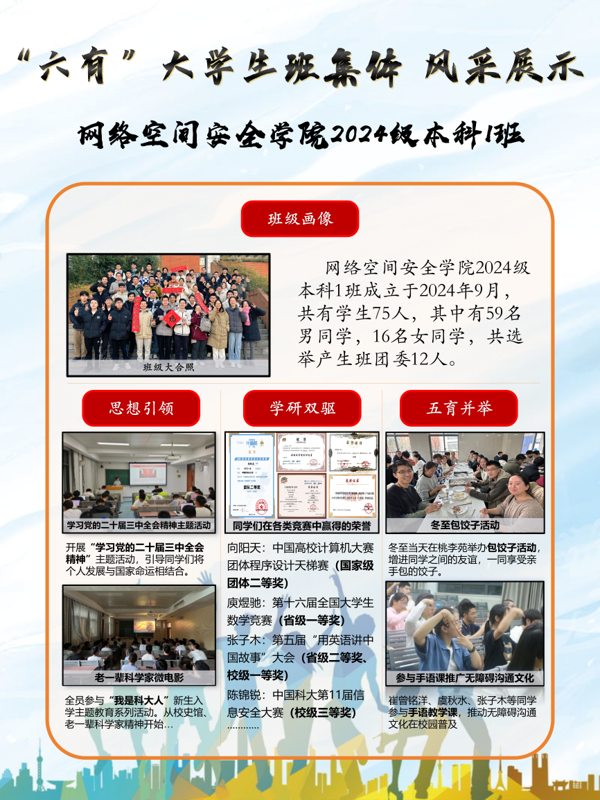 网络空间安全学院2024级本科1班成立于2024年9月,现有学生75人,其中男生59名、女生16名,共选举产生班团委成员12人。自成立以来,班级始终秉持“五育并举”理念,在思想引领、学研实践、文化建设等方面多点发力,成效显著。本学期,在班团委的凝心聚力与全体同学的共同奋斗下,班级成功斩获中国科学技术大学最高班集体荣誉——“六有”大学生班集体称号。这一殊荣既是对班级各项工作的高度认可,更凝聚着每一位同学的汗水与付出。