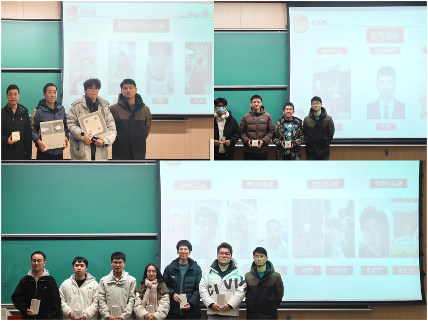 随后进入表彰环节,现场掌声热烈。为肯定同学们的辛勤付出与突出表现,大会对各类先进个人进行表彰:詹新宇、关家旺、但劲、周浩伟获评“项目之星”;王卓丰、张梦杰、屠依静、李在智、杨康、沈秋宏、邢志宏、张裕宁获评“部门之星”;李乐园、李祚龙、石琦获评“优秀部长”。大会为获奖同学颁发了荣誉奖品,树立了先进榜样。