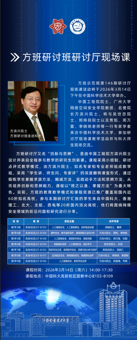 方班示范班第 146 期研讨厅现场课活动将于2026 年3 月 14 日(周六)14:00-17:30在中国科学技术大学高新校区图教中心举行。中国工程院院士、广州大学网络空间安全学院教授方滨兴院士将携吴枫院士、吴世忠院士、郑纬民院士及贾焰、周万雷、李晓明等专家学者来访科大,与来自全国 20 所顶尖高校的学子开展深度学术交流,共话网络安全领域创新与思辨。